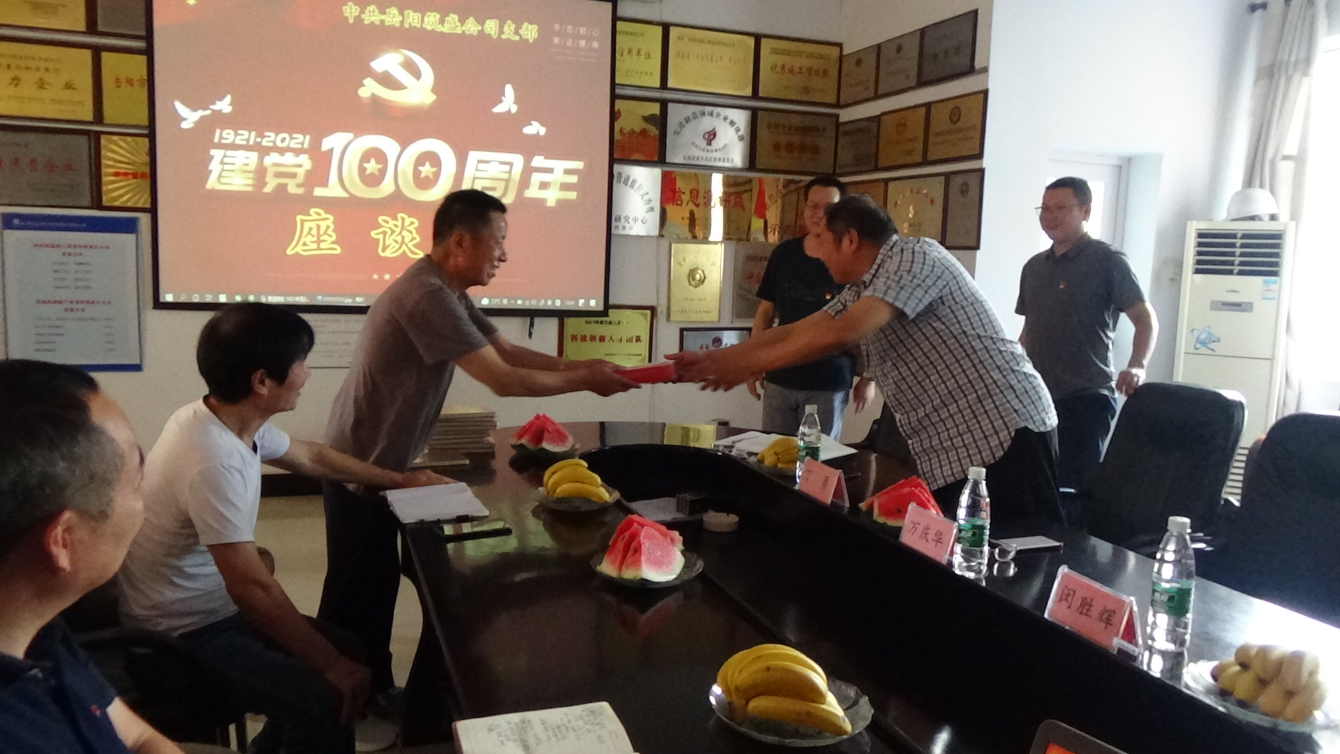 2021年6月23日, 岳陽(yáng)筑盛閥門管道有限責(zé)任公司黨支部在公司一樓會(huì)議室召開了建黨100周年座談會(huì),監(jiān)申橋工業(yè)園主任萬(wàn)慶華同志代表開發(fā)區(qū)工委給公司黨員左正泉同志頒發(fā)了“在黨五十周年”榮譽(yù)獎(jiǎng)?wù)拢?/span>
