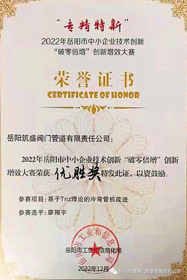 岳筑宣2022年12月6日訊:2022年12月5日我公司委派技術(shù)部廖翔宇工程師參加了2022年岳陽市“專精特新”中小企業(yè)技術(shù)創(chuàng)新“破零倍增”創(chuàng)新增效大賽基于Triz理論的冷彎管機改進(jìn)項目中榮獲優(yōu)勝獎!